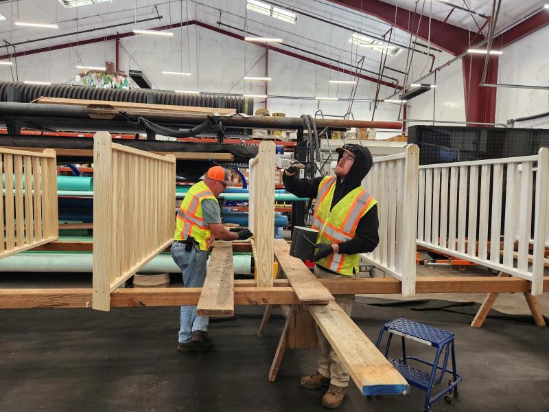 - Crews secured floor joists and composite decking to the new concrete slab.