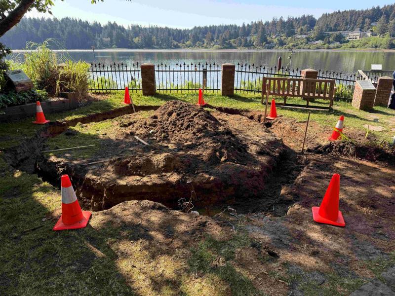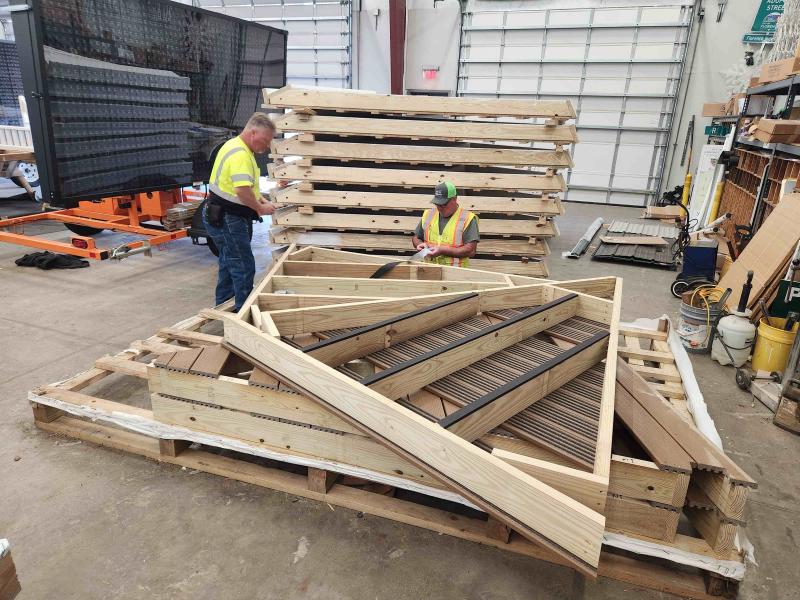 Public Works crews have excavated foundation footings for the new gazebo and are preparing for a concrete pour the week of May 5. The gazebo roof sections have also been laid out and stained with high-quality white stain in preparation for final assembly onsite.