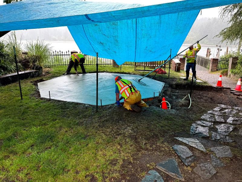 Public Works crews poured the concrete foundation and slab for the new gazebo on Thursday. Instead of wheelbarrowing 4 cubic yards of concrete from Bay Street to the gazebo location, we used a trailer-mounted concrete pumper—a huge win for efficiency and the crew’s backs.