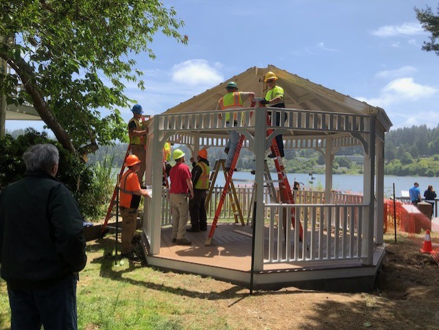 Public Works crews have been busy putting the final touches on the gazebo for the grand reopening and ribbon cutting. On Thursday morning, City Council was joined by City staff, members from the Central Oregon Coast Board of Realtors, as well as distinguished citizens to cut the ribbon and officially open the new gazebo for public use.