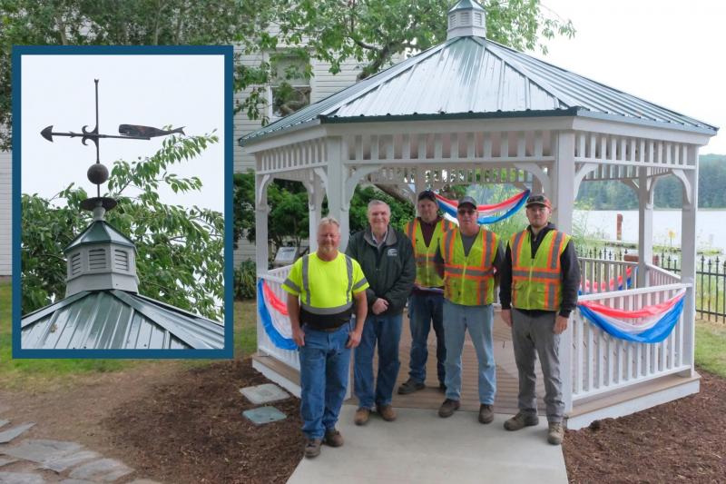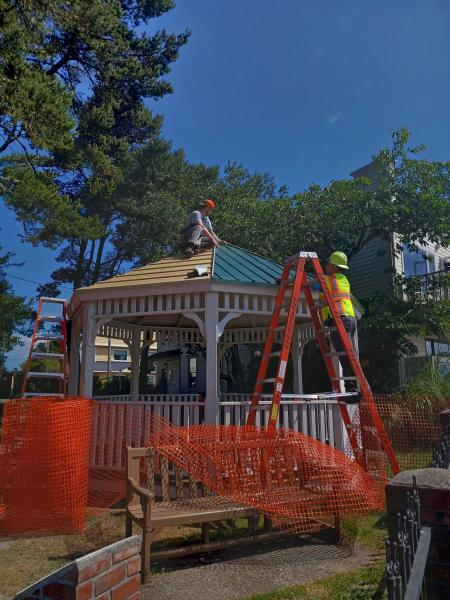Public Works crews installed the new standing seam metal roof on the gazebo, stained the cupola, and mounted the weather vane. After securing the weather vane to the cupola, the full assembly was installed atop the gazebo structure.